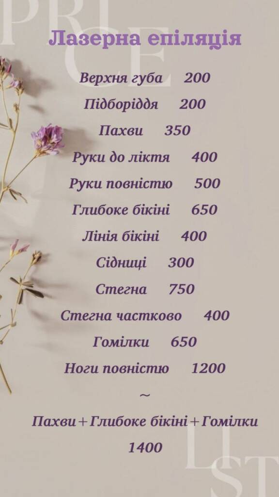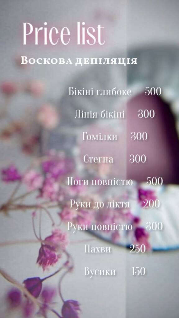 ВОСКОВА ДЕПІЛЯЦІЯ ЛАЗЕРНА ЕПІЛЯЦІЯ ПРОФЕСІЙНЕ ОБЛАДНАННЯ ЧАси роботи Ласкаво просимо до нашому салону: Понеділок – Субота: 9:00 – 20:00 Неділя: Вихідний Relax Now! Головні принципи – це безпека, комфорт та бездоганна гладкість! Про нас НАШІ ЦІНИ Знижка на першу процедуру:Лазерна епіляція - 50% Воскова депіляція - 20%